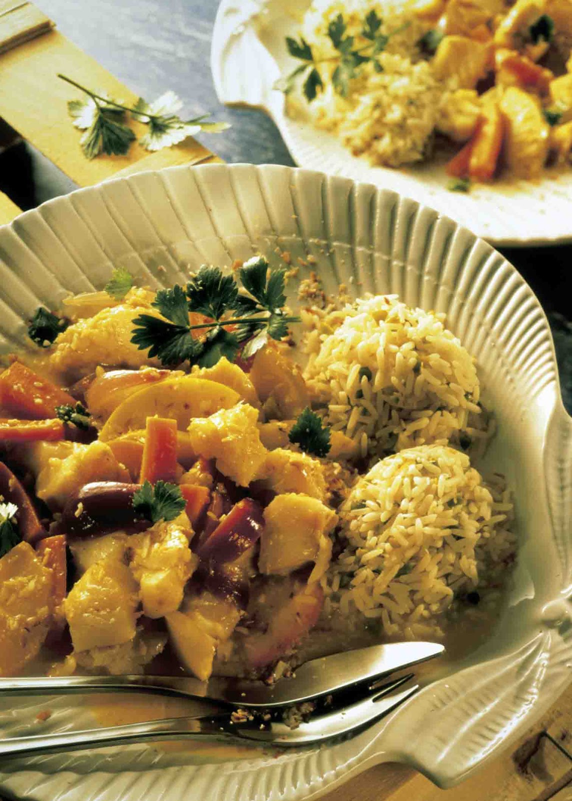 Reis mit gehackten Pistazien vermischen. Fisch-Curry mit Kokosraspeln